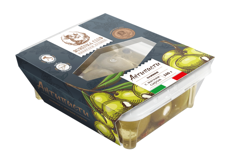 В антипасти BURЁNKA CLUB в качестве наполнителя используется сливочный сыр, который готовится по традиционной итальянской рецептуре, имеет жирность 70% и нежный сливочный вкус. Оливки BURЁNKA CLUB выращены на солнечных островах и собраны зелеными в октябре.