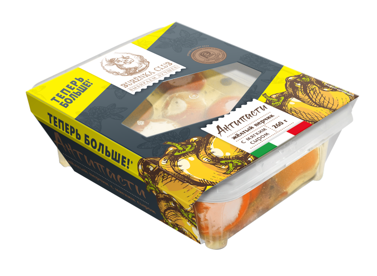 В антипасти BURЁNKA CLUB в качестве наполнителя используется сливочный сыр, который готовится по традиционной итальянской рецептуре, имеет жирность 70% и нежный сливочный вкус. Желтый перчик BURЁNKA CLUB - имеет оригинальную круглую форму, сочную мякоть, насыщенный вкус и необычный яркий цвет.