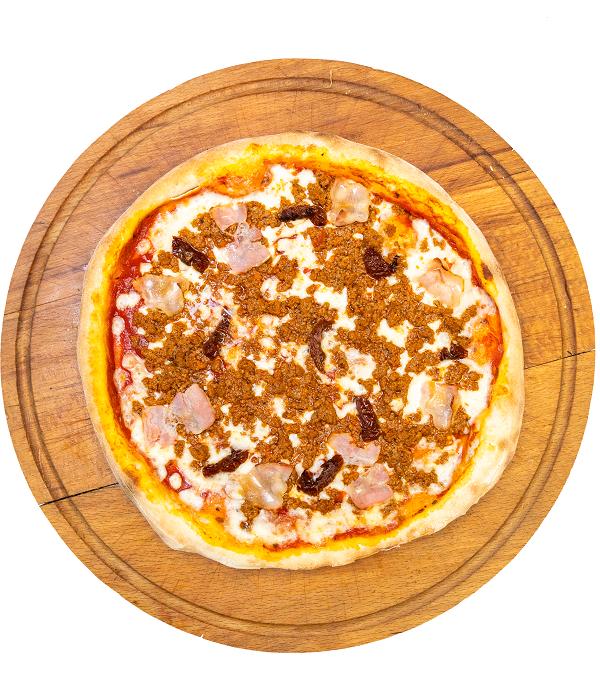 Пицца Болоньезе с томатами - это идеальное сочетание классического фарша болоньезе, хрустящего бекона, ароматных вяленых томатов, соуса томатного и растопленной моцареллы, которые создают неповторимый вкус и обеспечивают наслаждение каждым кусочком.
