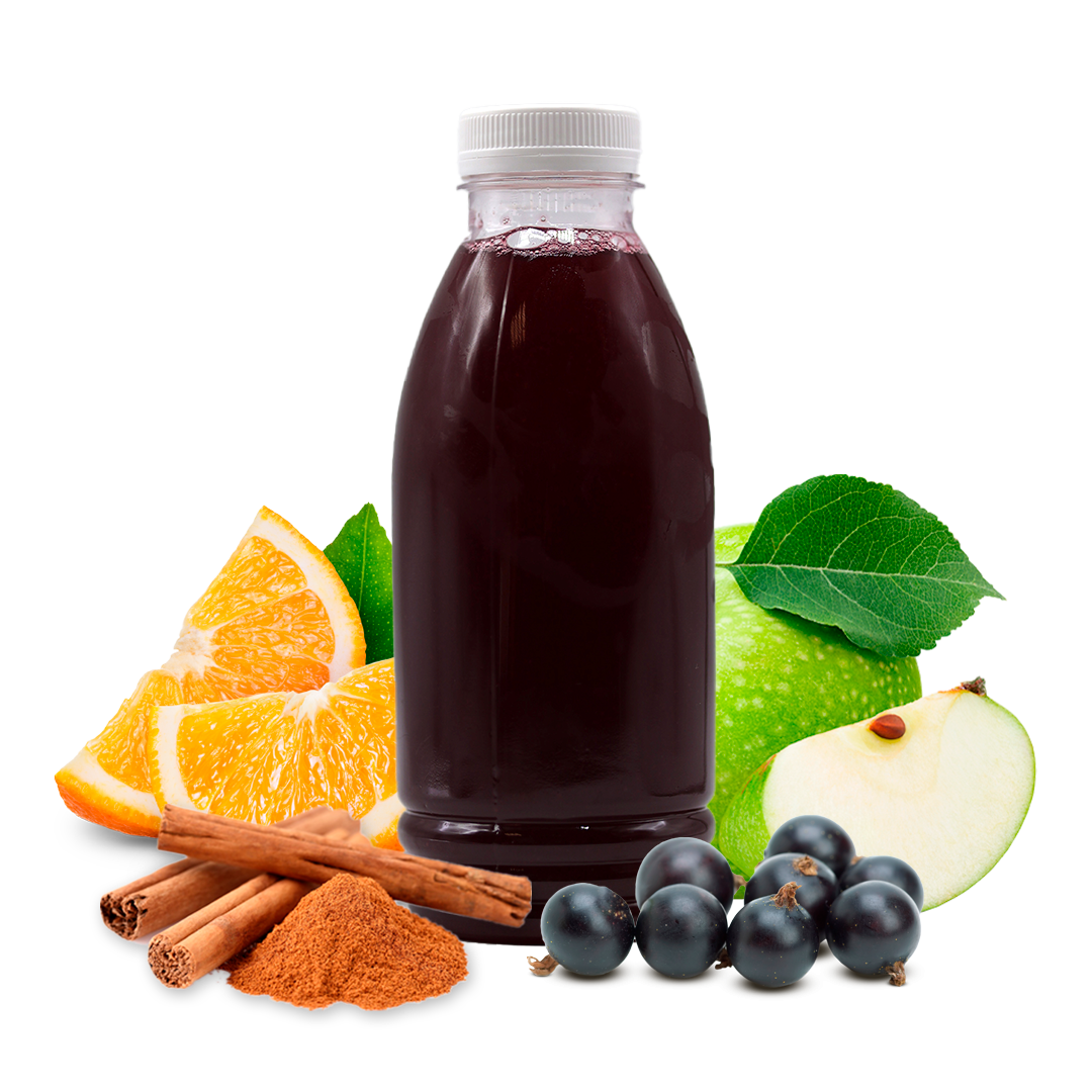 С этим напитком даже самый серый день станет тёплым и волшебным. Мы приготовили его из апельсинов, яблок и чёрной смородины. А для согревающего новогоднего аромата добавили корицу, имбирь, гвоздику и бадьян. Вкус получился сочным и ярким, с задорной кислинкой и пряными нотами. По желанию глинтвейн можно разогреть — будет ещё уютнее.