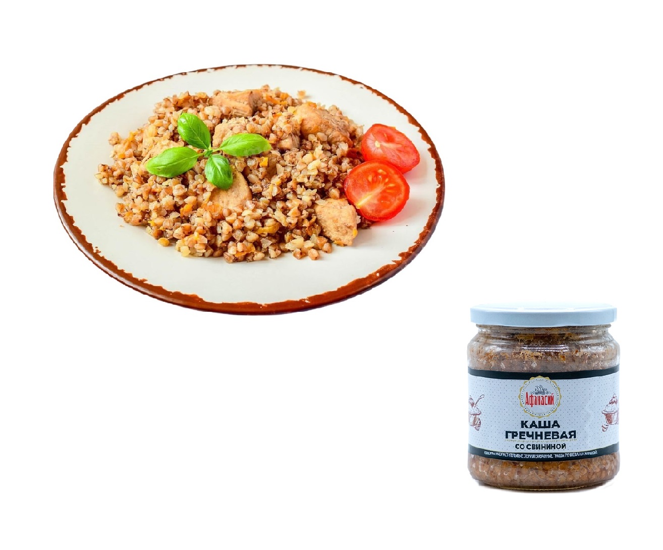 Крупа гречневая, свинина, шкура свиная, лук, соль пищевая, перец черный молотый, комплексная пищевая добавка (регулятор кислотности (цитрат натрия), стабилизаторы (каррагинан, камедь рожкового дерева), антиокислители (аскорбиновая кислота, аскорбат натрия), декстроза).