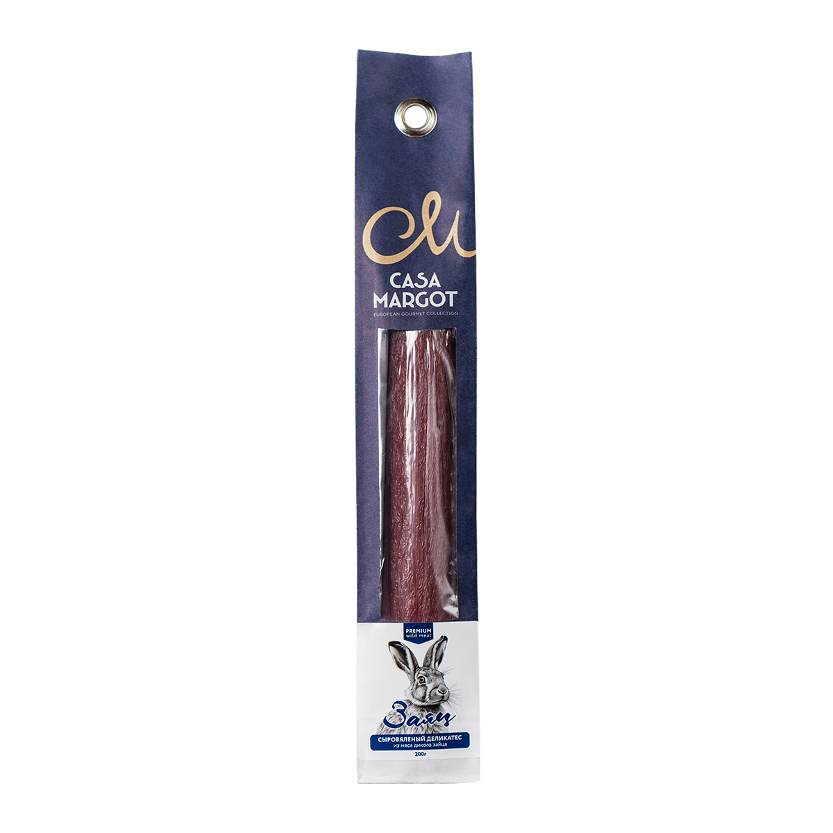 Мясо зайца, говядина, приправы и специи, смесь перцев, чеснок свежий, нитритно-посолочная смесь, стартовые культуры кисло-молочных бактерий.