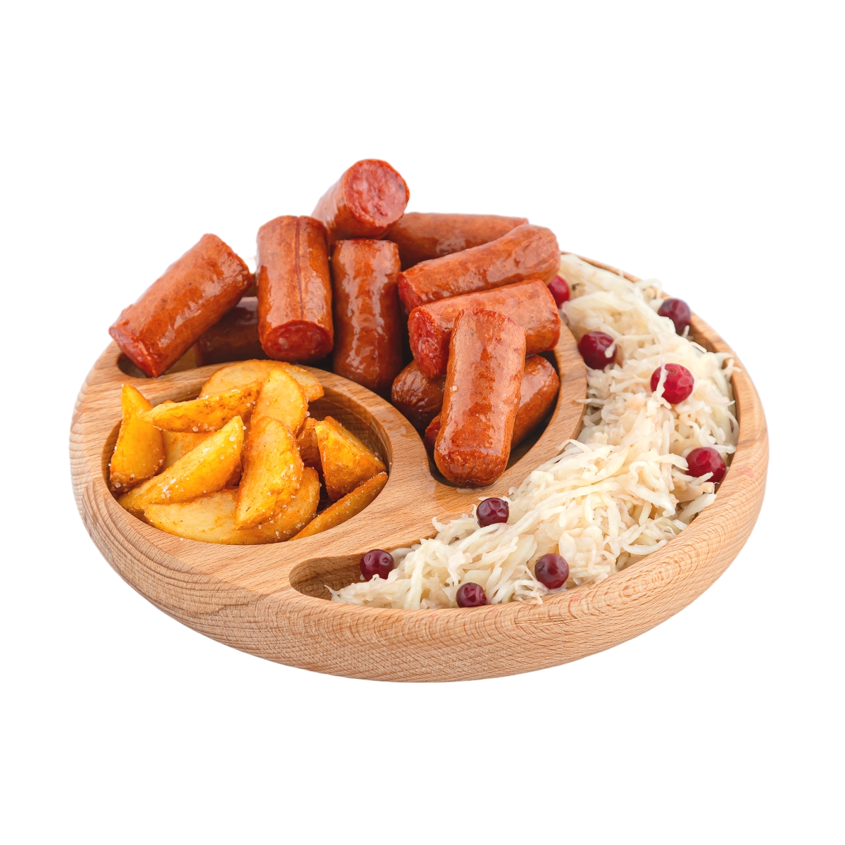 Колбаски говяжьи, картофельные дольки, квашеная капуста, клюква, соус сливочно-горчичный, соус томатный острый.