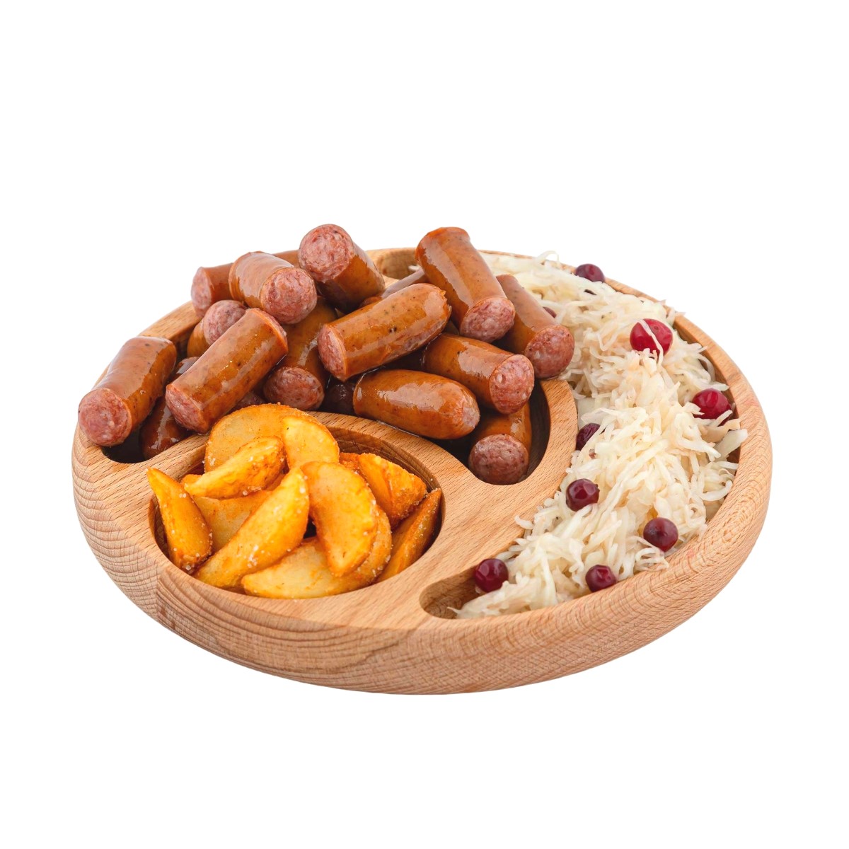 Колбаски свино-говяжьи, картофельные дольки, квашеная капуста, клюква, соус сливочно-горчичный, соус томатный острый.