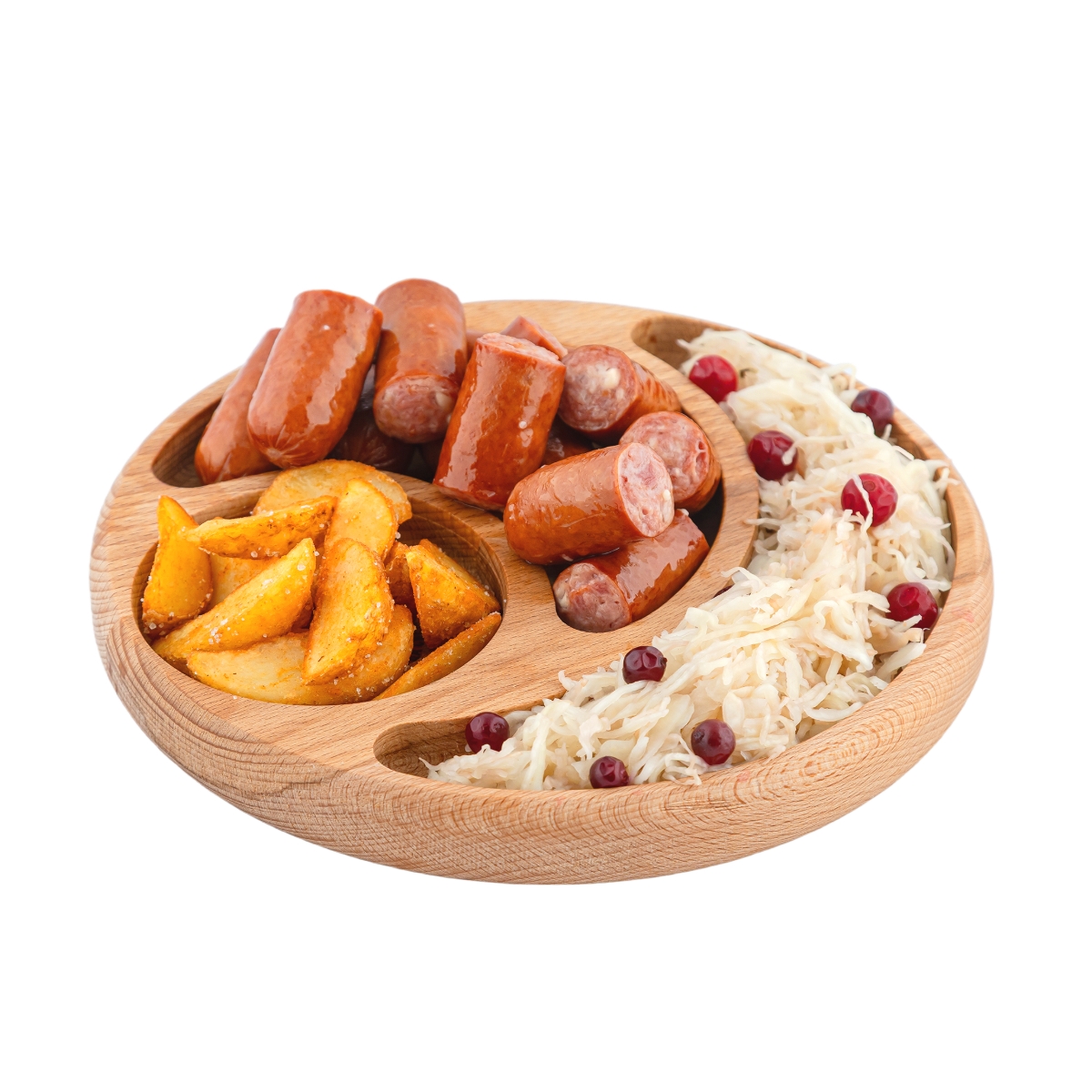 Колбаски свиные с сыром и беконом, картофельные дольки, квашеная капуста, клюква, соус сливочно-горчичный, соус томатный острый.