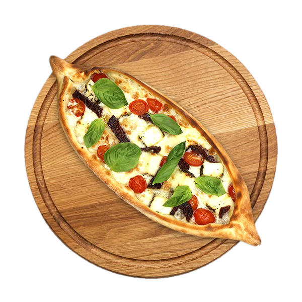 Тесто (мука, дрожжий, соль, сахар, вода, масло оливковое), моцарелла, халуми, черри, вяленые томаты, базилик.