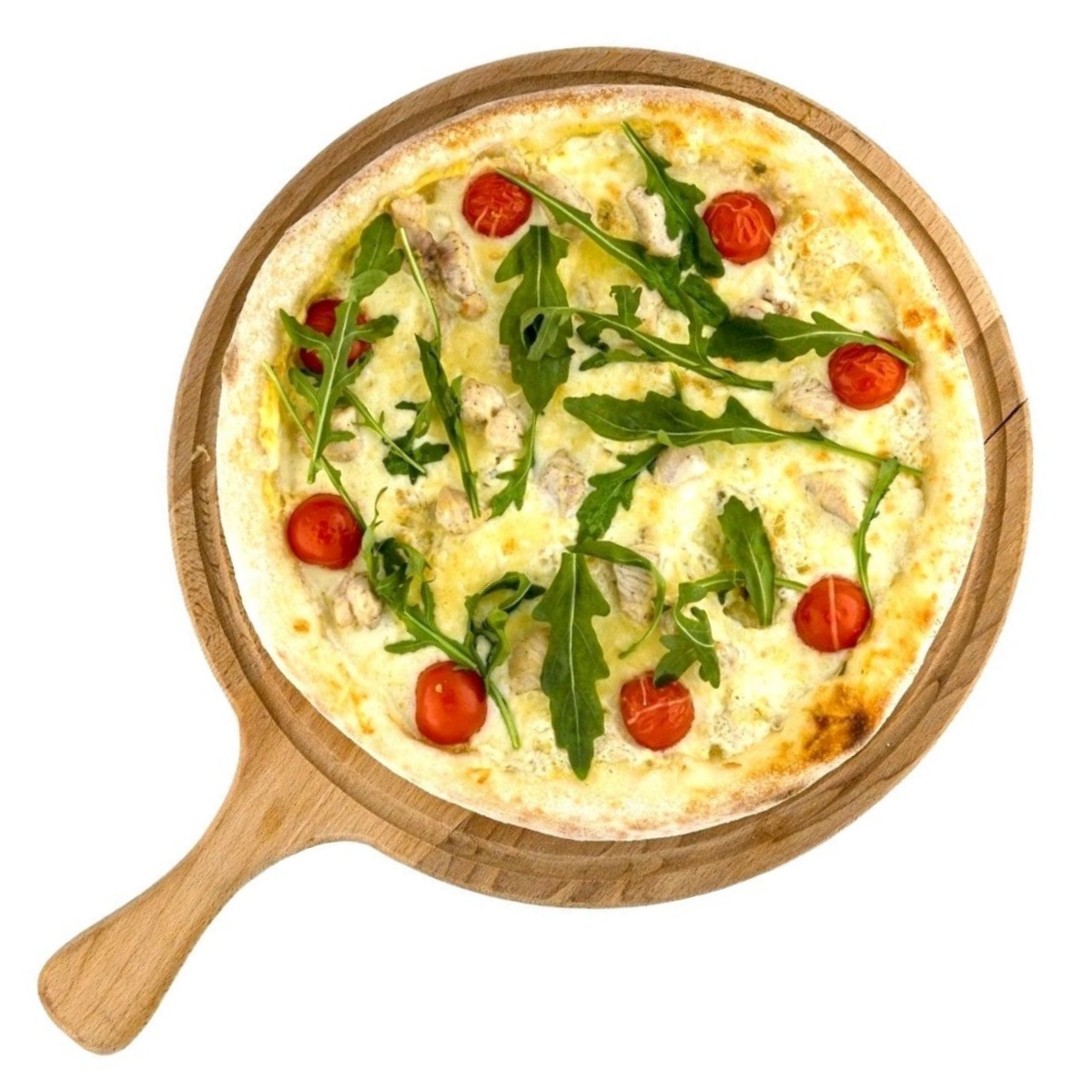 Тесто (мука, дрожжий, соль, сахар, вода, масло оливковое), соус цезарь (майонез, анчоусы, каперсы, хрен, горчица), моцарелла, курица, черри, пармезан, рукола.