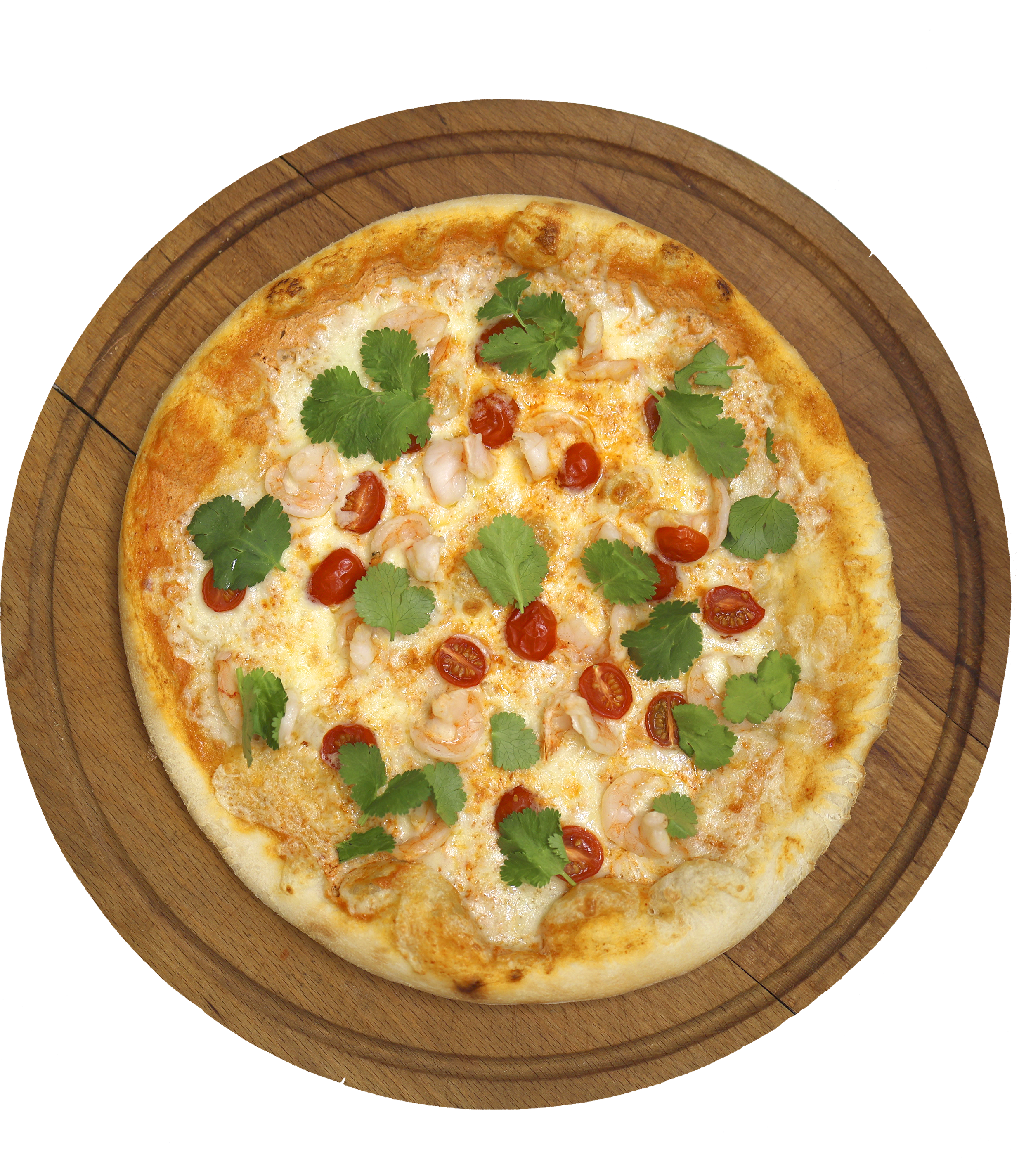 Тесто (мука, дрожжий, соль, сахар, вода, масло оливковое), паста том ям, сливки, моцарелла, креветки, черри, кинза.