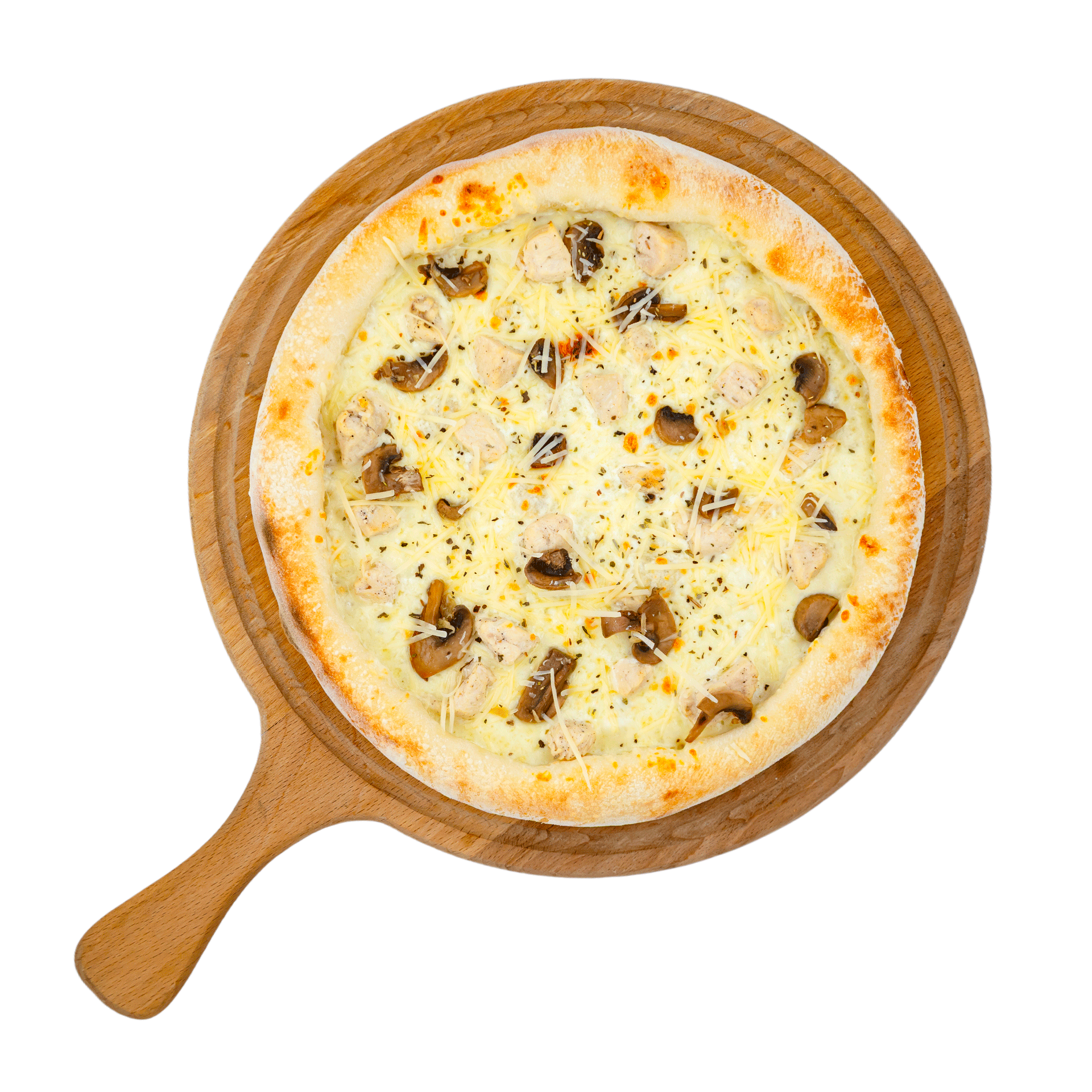 Тесто (мука, дрожжий, соль, сахар, вода, масло оливковое), сливки, моцарелла, курица, шампиньоны, пармезан, базилик.